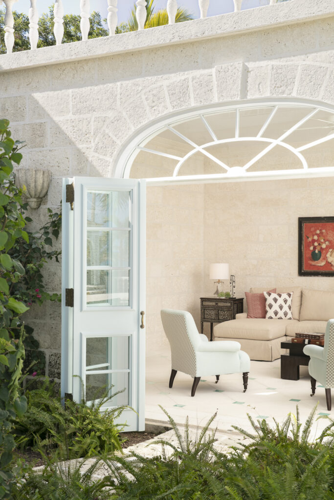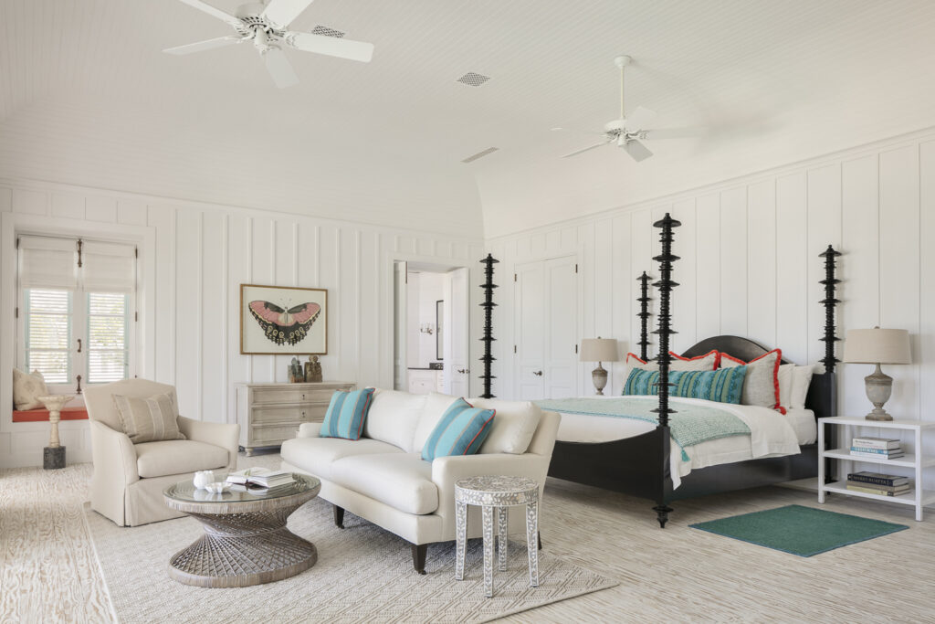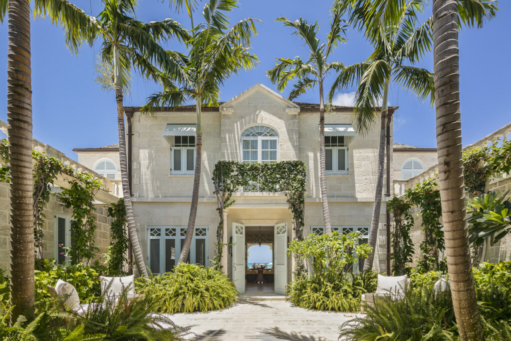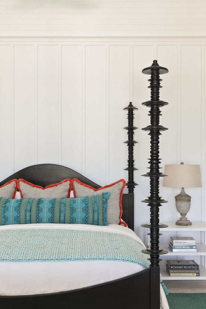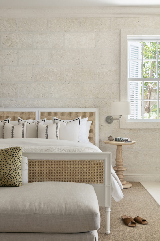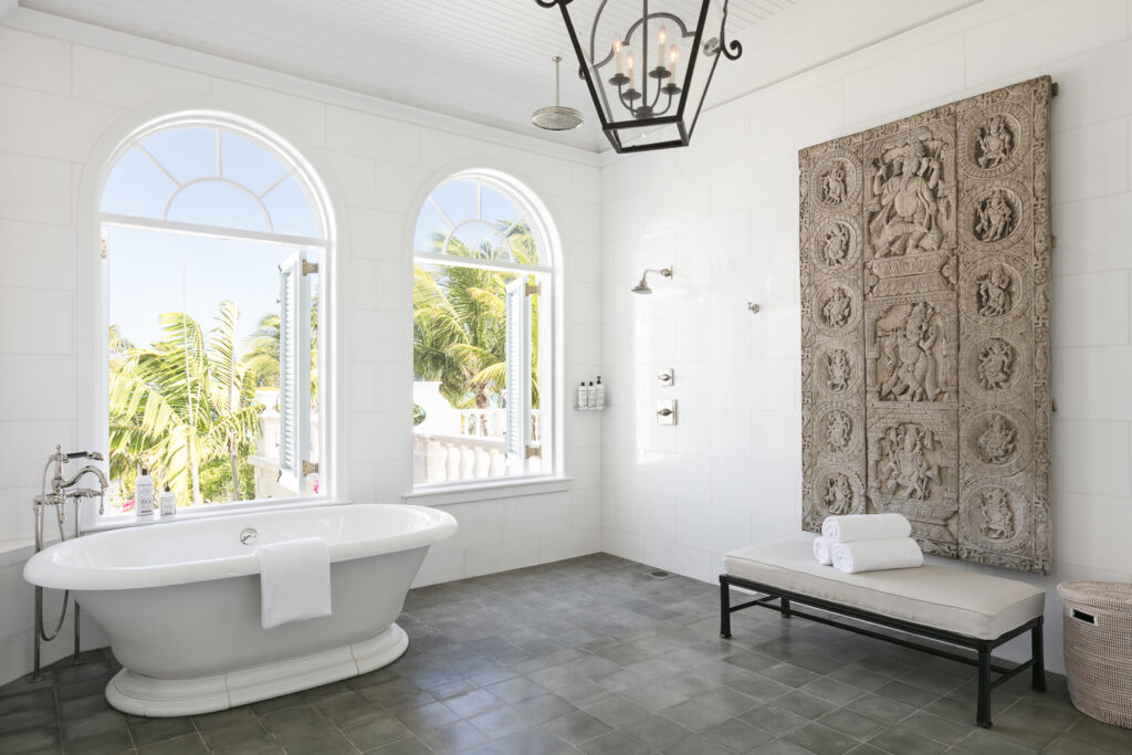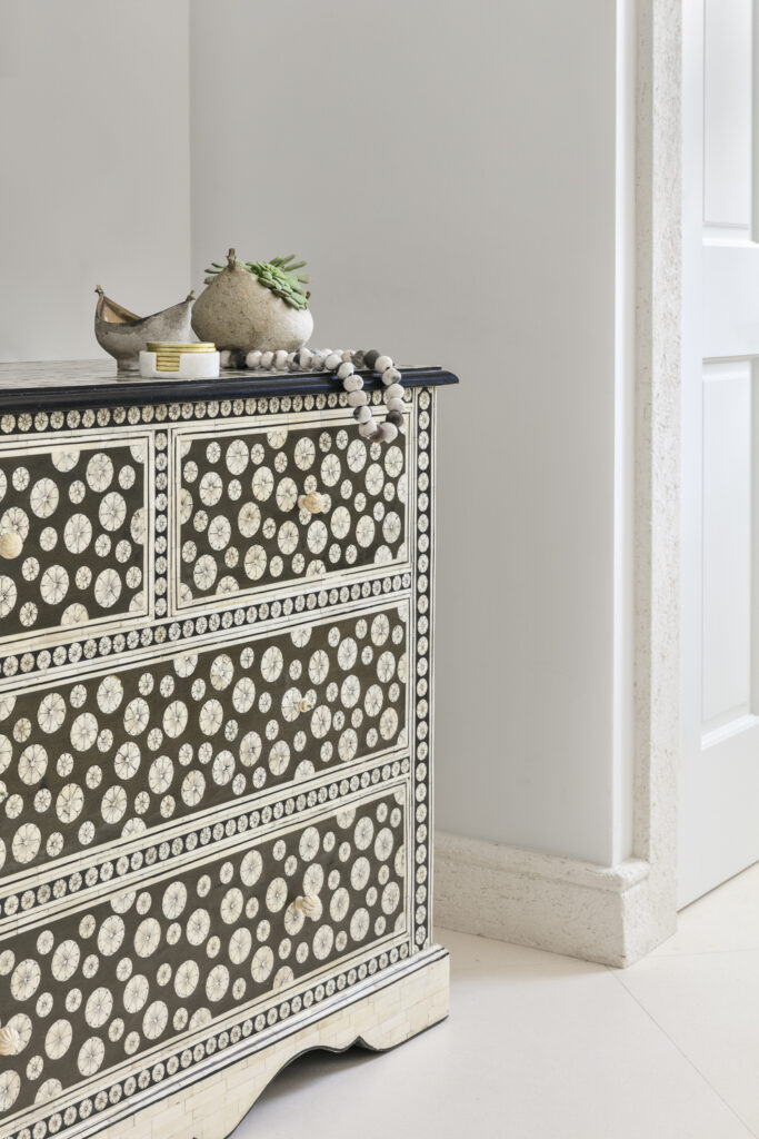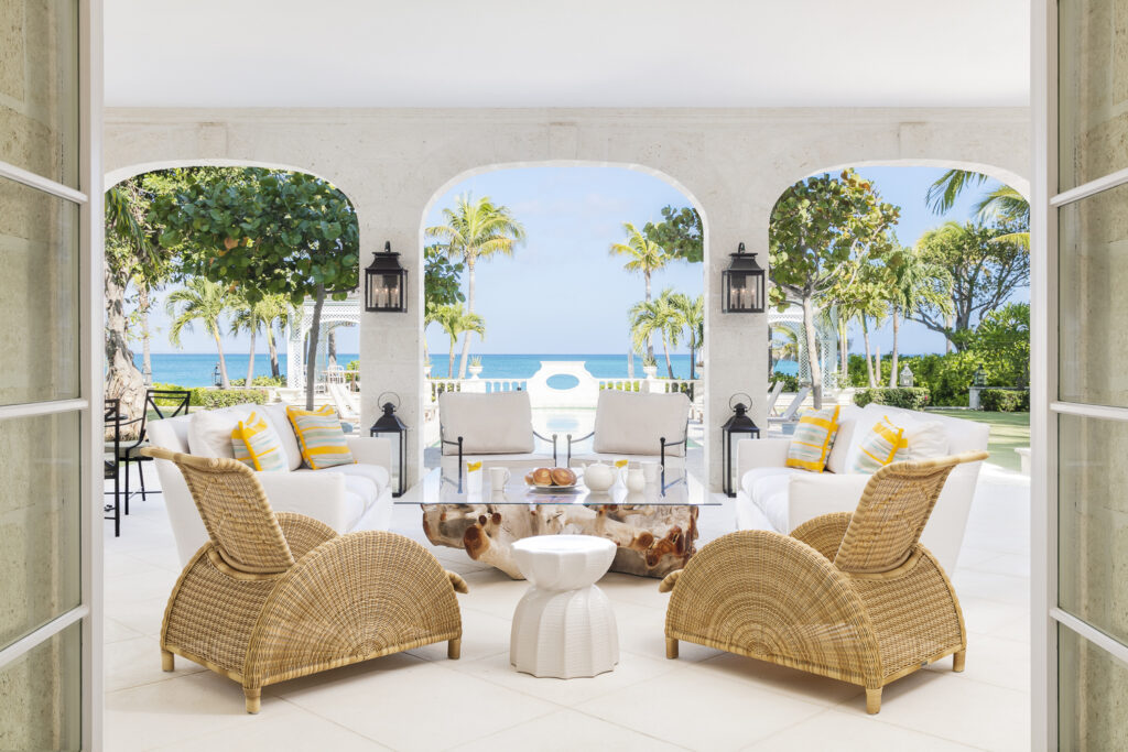 Finding inspiration from the Oliver Messel style villa, Domino Creative furnished this oceanfront property with a blend of occidental classics, like a four-poster mahogany bed, and Indian treasures, like inlaid bone dresser, to create a distinctly West Indian gem.