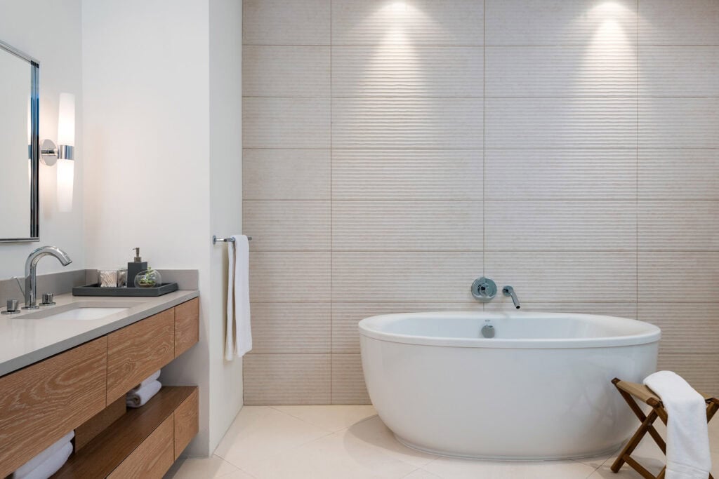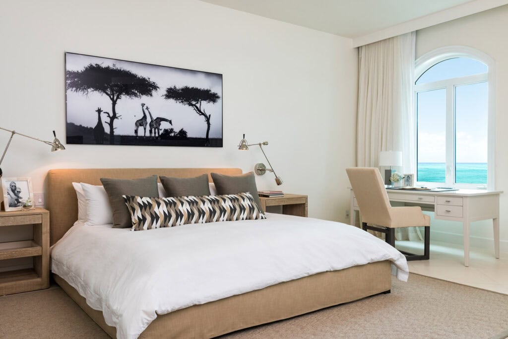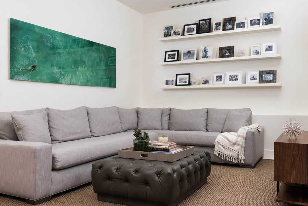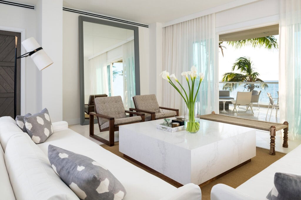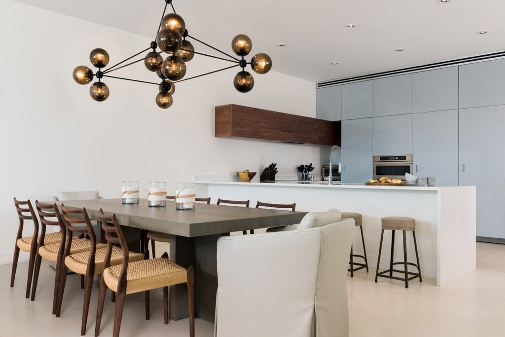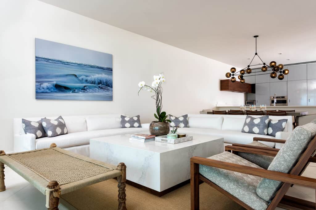 This three-bed oceanfront condominium was gut renovated from floors to ceiling plan, kitchen to baths to create a modern clean palette. Custom furniture pieces anchor the living and dining spaces, with modern accents in organic finishes throughout.